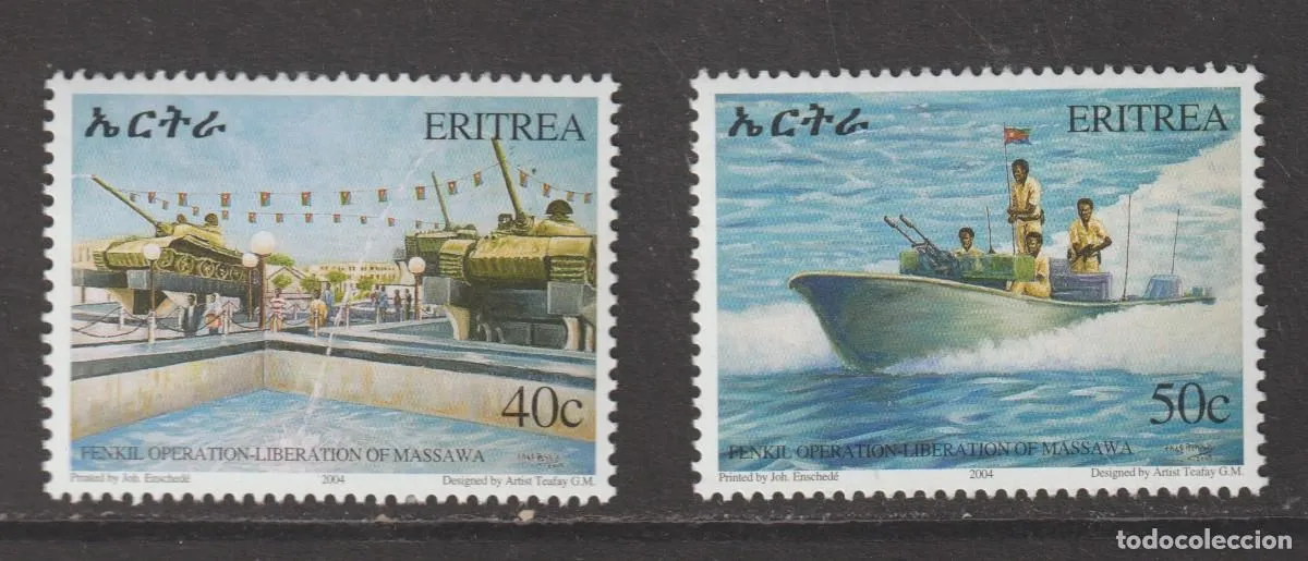 Bloque de 2: 14 ANIVERSARIO DE LA OPERACIÓN FENKIL, AÑO 2004. LIBERACIÓN PORTUARIA DE MASSAWA. 40 Cent. y 50 Cent.