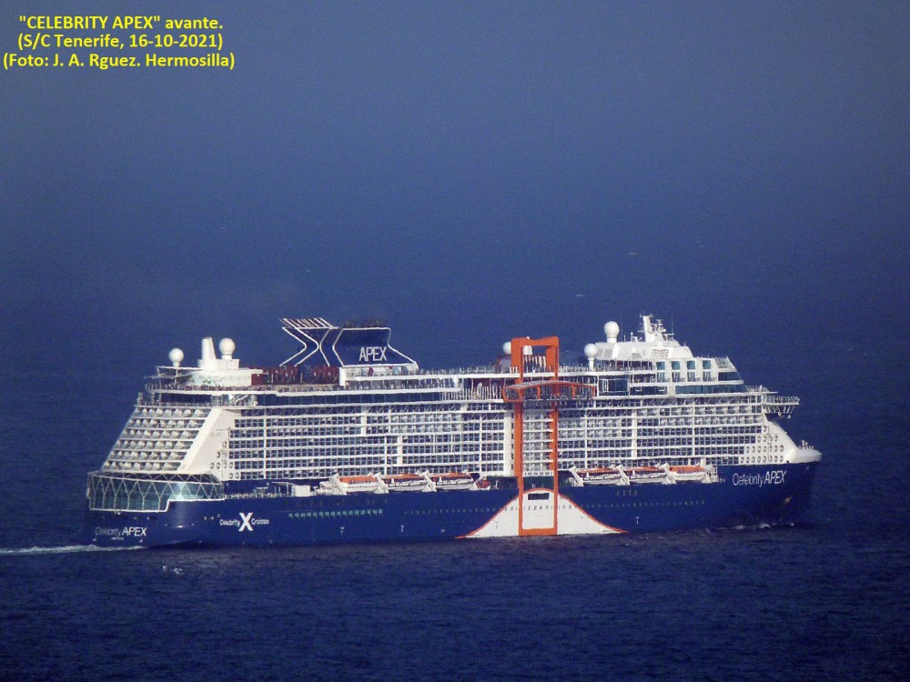 Llegó esta mañana, sobre las 07:15 horas, al muelle Sur de la dársena de Anaga, procedente del puerto de La Luz (Gran Canaria-España), después de una travesía de 9 horas y 46 minutos, el crucero CELEBRITY APEX, con código IMO 9838383, construido en los en los los astilleros franceses Chantiers de l´Atlantique, de St. Nazaire-Nantes (Francia), en marzo de 2020 Diseño vanguardista realizado por los arquitectos y diseñadores de interiores más importantes del mundo. Tiene un tamaño de 306 x 50 m, siendo su calado de 8,5 m. Propulsión: (5) x Wärtsilä con una potencia total de 53.760 Kw. (*), que le mantiene una velocidad media de 18 knots, llegando a alcanzar los 22,7 nudos.