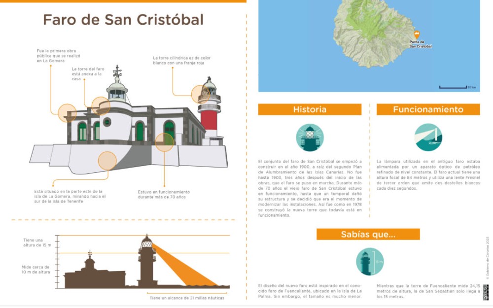 Un halo enigmático que encierra curiosas historias y leyendas conquistando con el paisaje que los rodea, siendo luz y guía frente al mar, así son los FAROS de nuestra isla. Casi 200 son los faros que iluminan la costa española y en La Gomera destaca el FARO DE SAN CRISTÓBAL. Tanto los acabados de las puertas y ventanas como las rocas utilizadas en la esquina del inmueble estaban hechos con materiales de origen volcánico. Por su parte, el combustible utilizado para el encendido de la lámpara era un petróleo refinado, coloquialmente denominado gas o simplemente petróleo, para diferenciarlo de la gasolina.
