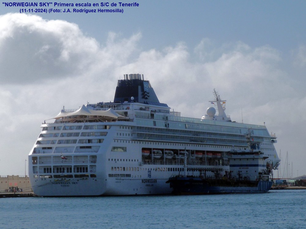 Llegó esta mañana, sobre las 08:30 horas, al muelle Sur de la dársena de Anaga, procedente del puerto de Funchal-Madeira (Portugal), después de una travesía de 1 día y 12 horas, el crucero NORWEGIAN SKY, con código IMO 9128532, construido en los en los astilleros Bremer Vulcan AG, de Bremer-Vegesack (Alemania) y completado por el también astillero alemán Lloyd Werft, de Bremerhaven en septiembre 1999-junio 2004 y reacondicionado del 2008-2024, con sus elegantes interiores y un ambiente pensado para la relajación en alta mar. Tiene un tamaño de 259 x 36 m, siendo su calado de 8 m. Propulsión: (6) x MAN-B&W, con una potencia total de 50.700 Kw./68.932 Hp., (*) que le mantiene una velocidad media de 16,5 knots, llegando a alcanzar los 20 nudos.