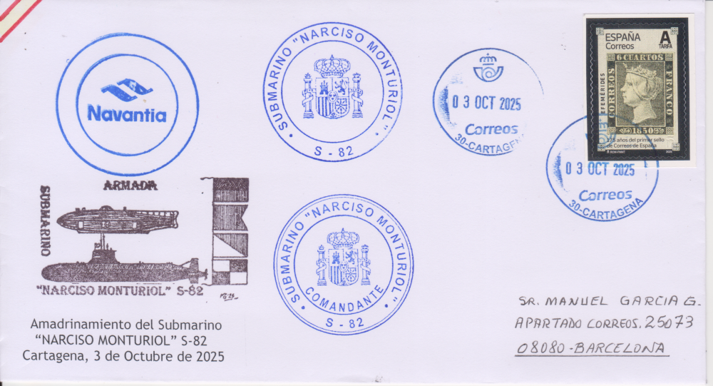 En la parte inferior izquierda, se puso la “marca” con los perfiles del “Ictineo” y el S 82, orlado con el texto “ARMADA-SUBMARINO NARCISO MONTURIOL S-82”, y a la derecha, las 4 banderas de su código internacional de señales: Eco-Bravo-Oscar-Lima.En la parte superior, los sellos oficiales de “Navantia”, Submarino y matasellos de la Oficina Principal de Cartagena. Aclarar que, en esto, no hay ningún tipo de “negocio”. Al contrario. Los gastos de confección de la “Marca”, franqueos, envíos, etc. se han pagado “a escote” entre los 14 coleccionistas.