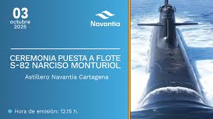 A las 12,30 horas, del viernes 3 de octubre de 2025, en el Astillero de “Navantia” en Cartagena, se celebró la ceremonia de amadrinamiento del “NARCISO MONTURIOL” S 82, segundo de la clase “Isaac Peral”. La Madrina fue la Sra. Dª Isabel López Fernández, esposa del JEMAD, Almirante General, D. Teodoro López Calderón, que activó el sistema de lanzamiento de una botella de vino español contra el costado de babor del buque, sujeta a una cinta con los colores de la Bandera de España.