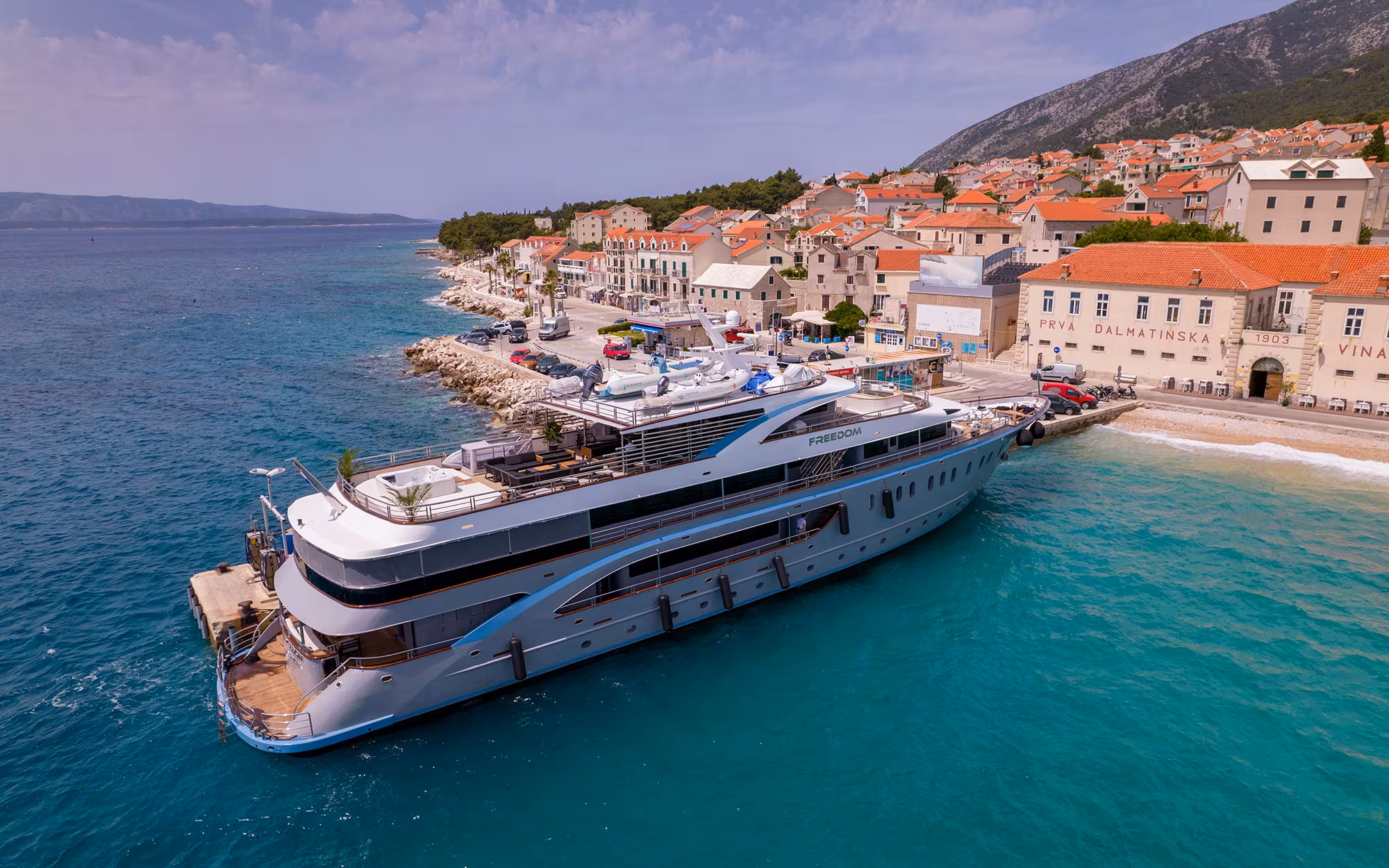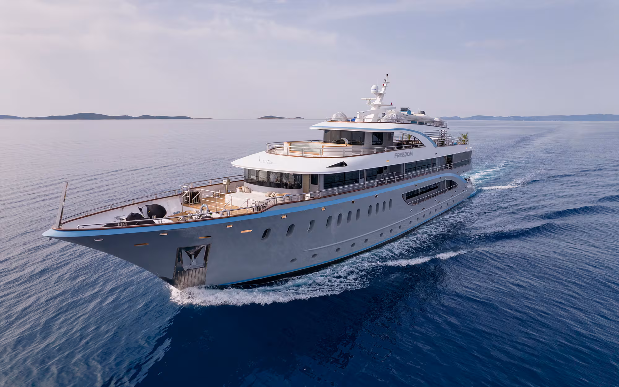 El FREEDOM es un lujoso megayate con su diseño elegante y estilizado, tiene una vista impresionante para contemplar en mar abierto. Su velocidad de crucero es de unos cómodos 12 nudos, tiene una autonomía de más de 4.000 millas náuticas y, está equipado con la última tecnología, lo que garantiza un viaje suave y agradable para todos a bordo. Puede alojar cómodamente a 22 huéspedes y una tripulación de 26 personas, ofreciendo un alojamiento sofisticado en sus 11 camarotes con baño, exquisitamente decorados. Las fotografías son de la página web del propio yate.