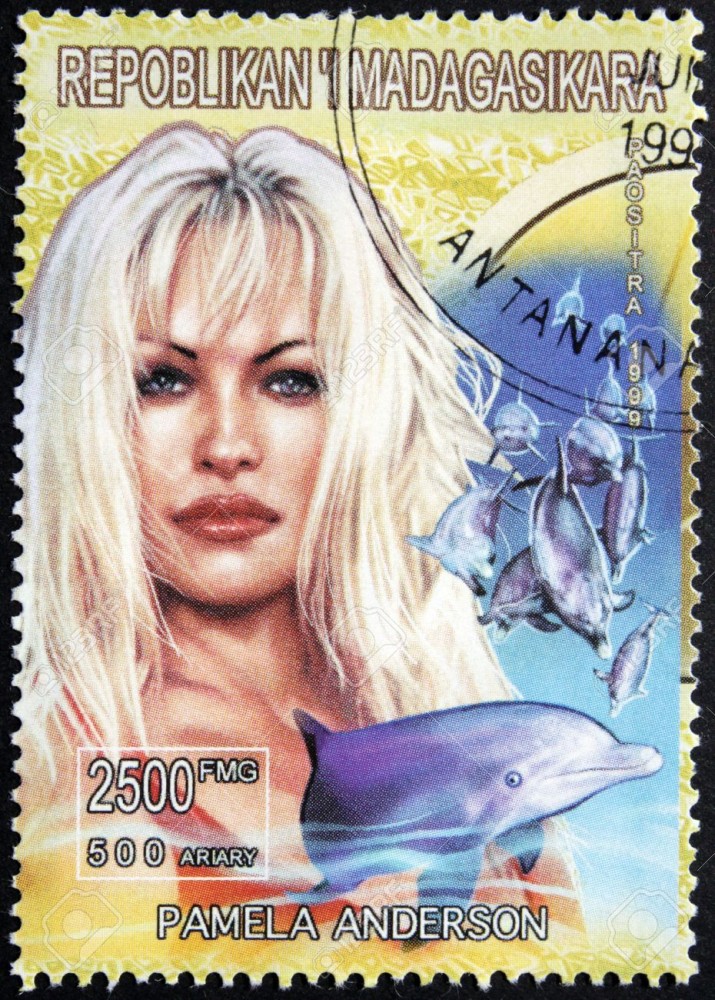 ACTORES DE CINE, PAMELA ANDERSON: VIGILANTE DE LA PLAYA. 500 Ar = 2.500 FMG.