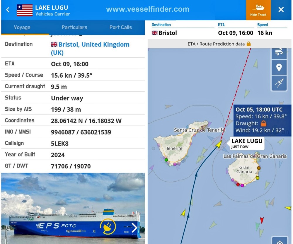 EL CAR CARRIER "LAKE LUGU" (IMO 9946087) CRUZO AYER TARDE, RUMBO NORTE, ENTRE TENERIFE Y GRAN CANARIA: Procedente del puerto japonés de Hit...