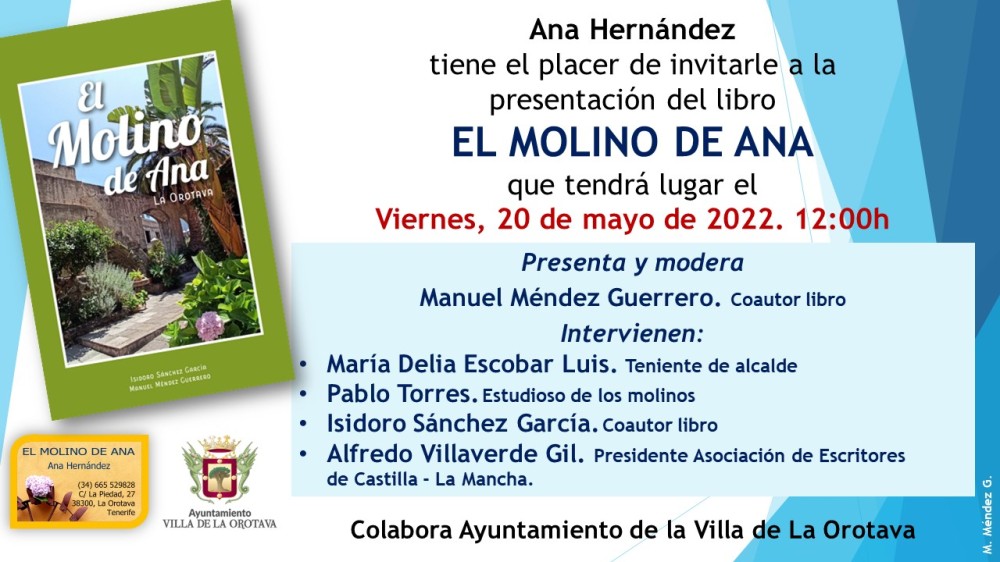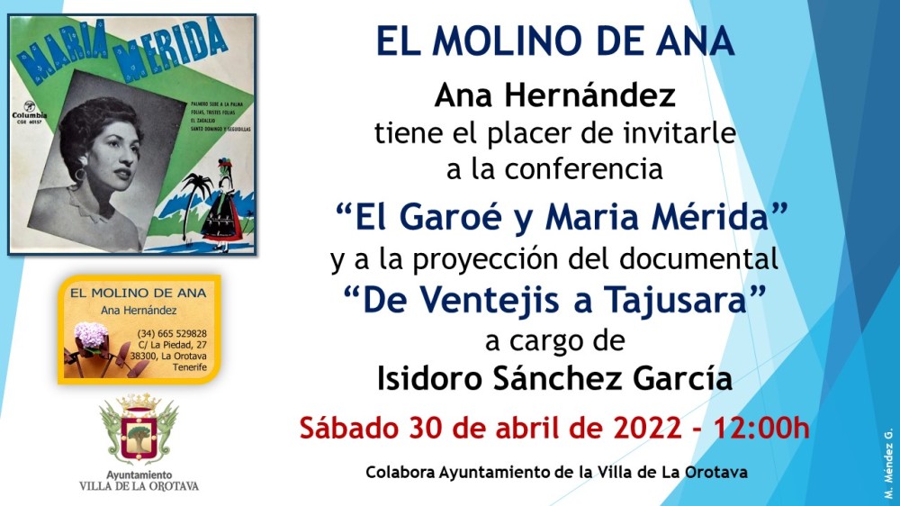 El pasado sábado día 30 de abril, en el “MOLINO DE ANA” de la Orotava, lugar donde, mensualmente se realizan diferentes charlas y actividades, con la colaboración del Ayuntamiento de la Villa de La Orotava, tuve la suerte de asistir y participar en la conferencia de D. Isidoro Sánchez García, “EL GAROÉ Y MARÍA MÉRIDA”, y posteriormente, la proyección del video, “DE VENTEJIS A TAJUDARA”, producción del propio conferenciante. Unas horas maravillosas escuchando al Sr. Sánchez, del que “reproducimos” su introducción. En un marco incomparable como el MOLINO LA PIEDAD, situado entre la calle Cubo Alto y la Plaza de La Piedad, que fue construido por D. Andrés Xuárez Gallinato en el siglo XVI. Estás siendo cuidadosamente restaurado, a su fisonomía original por su actual propietaria, Dª. Ana María Hernández Martín, quien fue la persona que presentó a D. Isidoro Sánchez.