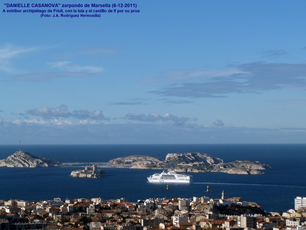 (6-12-2011) "DANIELLE CASANOVA" ZARPANDO DE MARSELLA, DEJANDO POR ESTRIBOR EL ARCHIPIELAGO DE FRIULI, CON LA ISLA Y EL CASTILLO DE IF, DONDE EL DRAMATURGO FRANCES ALEJANDRO DUMAS, DESARROLLA GRAN PARTE DE SU OBRA "EL CONDE DE MONTECRISTO".
