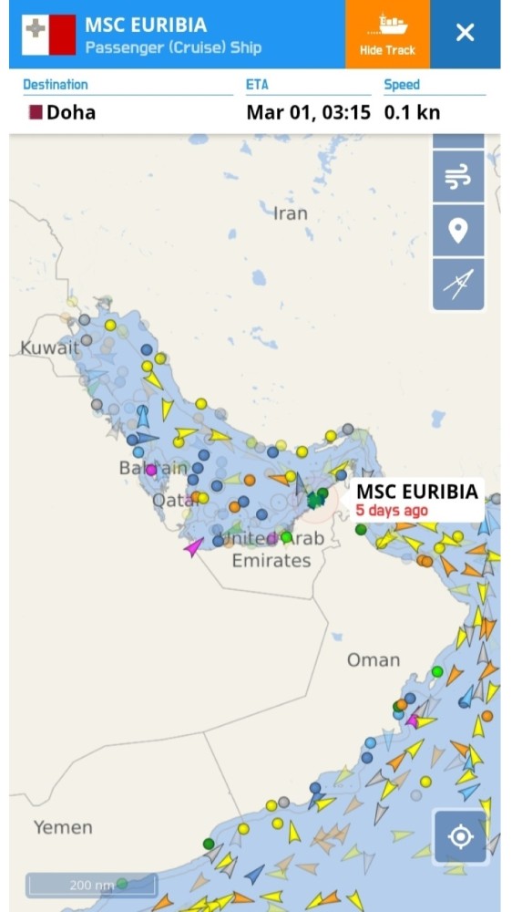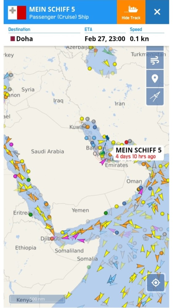 LOS CRUCEROS "MEIN SCHIFF 4", "MEIN SCHIFF 5" Y "MSC EURIBIA", VIEJOS CONOCIDOS DEL PUERTO DE SANTA CRUZ DE TENERIFE, SE ENCUENTRAN DESDE HACE VARIOS DIAS ATRAPADOS EN LOS PUERTOS DE ABU DHABI Y DOHA, CON MOTIVO DE LA GUERRA DE IRAN: Los tres navegan con bandera de Malta.