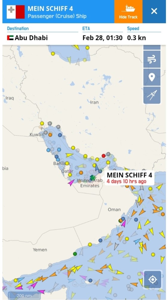 El "MEIN SCHIFF 4" (2015) (IMO 9678408), llegó a Abu Dhabi (Emiratos Arabes Unidos) el pasado día 28 de febrero. Su primera escala en Santa Cruz de Tenerife la efectuó el 13 de octubre del 2015.