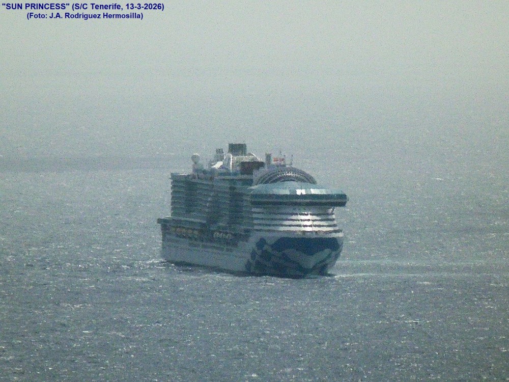 El "SUN PRINCESS", abanderado en Bermuda y con indicativo ZCHD6, procede de Florida (EE.UU.) y tenía prevista para mañana su escala en nuestro puerto, dentro del crucero de turismo que actualmente está efectuando, escala que sigue vigente, por lo que el buque, una vez finalizado el desembarco de los pasajeros mencionados, ha puesto rumbo al Sur de las islas, para permanecer en standby y mantener sus escalas previstas.
