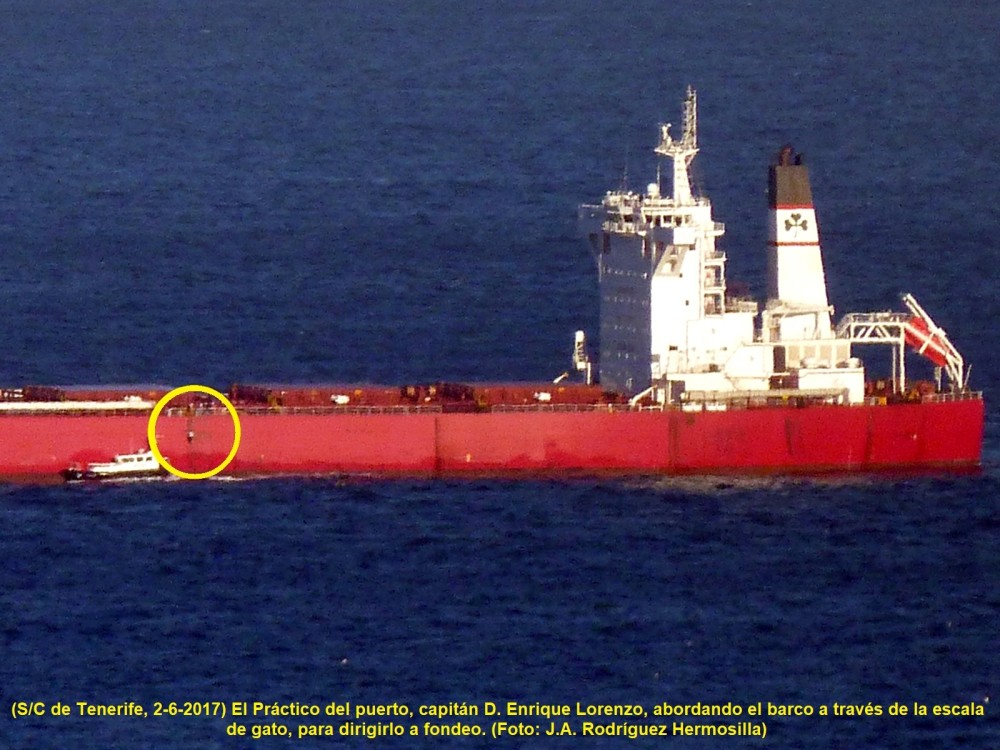 Sus principales características son: 93.490 TRB., eslora de 292,00 m., manga de 45,00 m., calado de 17,40 m. y velocidad de 12,0 nudos. En la segunda foto podemos ver el momento en que el Práctico de Santa Cruz de Tenerife, capitán D. Enrique Lorenzo, accedía a bordo, por la escala de gato, para dirigirlo al fondeadero.