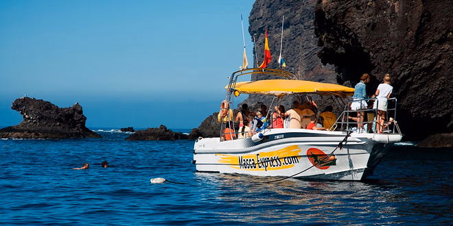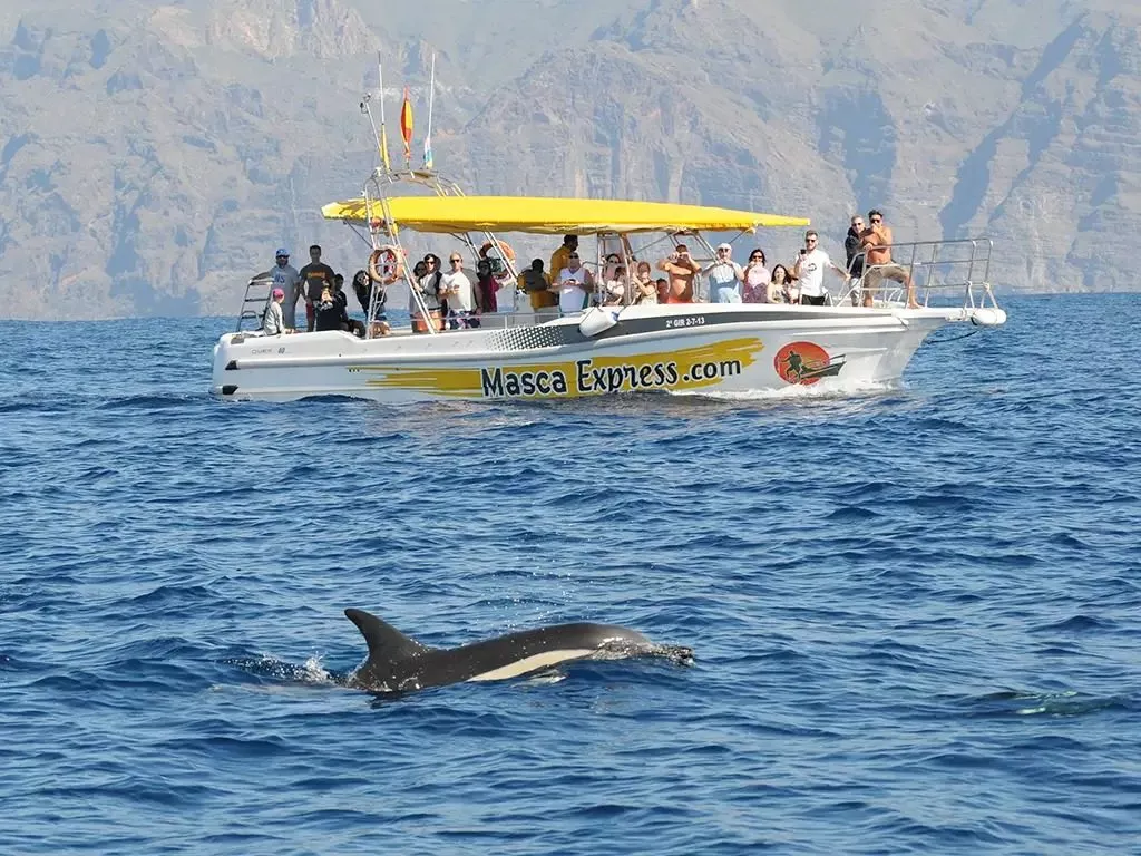 ITINERARIO: 11:30 h: Salida en guagua desde la Plaza de Europa en Santa Cruz de Tenerife. 13:30 a 15:30 h: Recorrido en barco (dos horas a bordo del "MASCA EXPRESS", con capacidad máxima de 32 pasajeros) desde el puerto de Los Gigantes en busca de cetáceos. También navegaremos cerca de los impresionantes acantilados de Masca y Los Gigantes. Si el tiempo lo permite, haremos una parada para que puedas darte un baño refrescante en una de las calas de aguas cristalinas, como Masca, Barranco Seco o Juan López. 16:00 h: Regreso en guagua desde Los Gigantes.