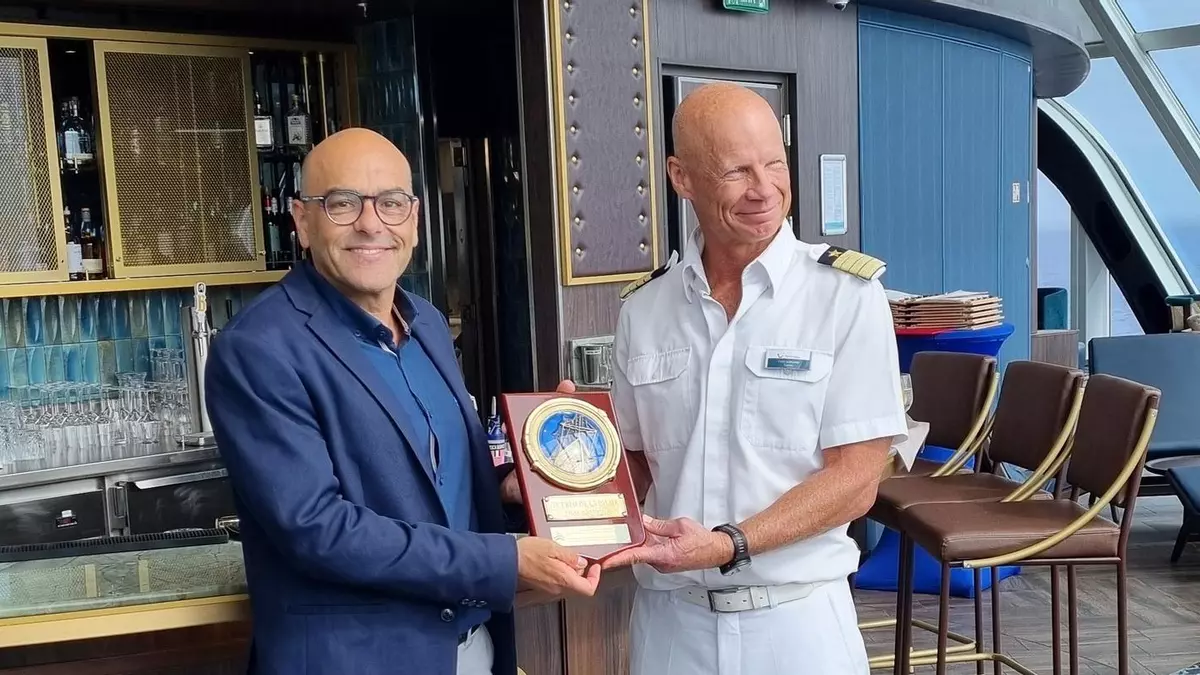 Con motivo de la primera visita a la Isla del ‘MEIN SCHIFF RELAX’, D. Jorge Amado Guerra, jefe de División de la Zona Portuaria La Palma, realizó a bordo del buque el tradicional intercambio de metopas con el capitán. Al acto asistieron el alcalde de Santa Cruz de La Palma, D. Asier Antona; la directora insular de Turismo del Cabildo, Dª. Beatriz Páez; así como representantes del consignatario y su subagente, el Sr. Cabrera Martín.