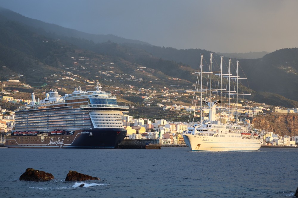 El imponente buque de crucero ‘MEIN SCHIFF RELAX’ y el elegante velero ‘'CLUB MED 2', también crucero, han realizado este jueves, 6 de noviembre, sus primeras escalas en el Puerto de Santa Cruz de La Palma, informa la Autoridad Portuaria en sus redes sociales. El ‘MEIN SCHIFF RELAX’ ha arribado a primeras horas con un total de 4.166 pasajeros a bordo y, el velero 'CLUB MED 2'’, con 220 viajeros.
