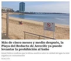 El Servicio Canario de Salud ha levantado las restricciones después de que las últimas analíticas del agua desvelaran que era apta para el baño. Según el Ayuntamiento, las analíticas periódicas que se realizaban en esta playa "revelaban desde el mes de diciembre pasado que las aguas eran aptas para el baño". Según el Consistorio, la restricción que ha mantenido hasta este miércoles Sanidad, y que ha respaldo el Ayuntamiento de Arrecife, pretendía exigir al Consorcio del Agua y Canal Gestión que se resolvieran las incidencias en la red de saneamiento, que era donde estaba en origen de esos vertidos, y originada desde hacía décadas, parámetros inadecuados para el baño.